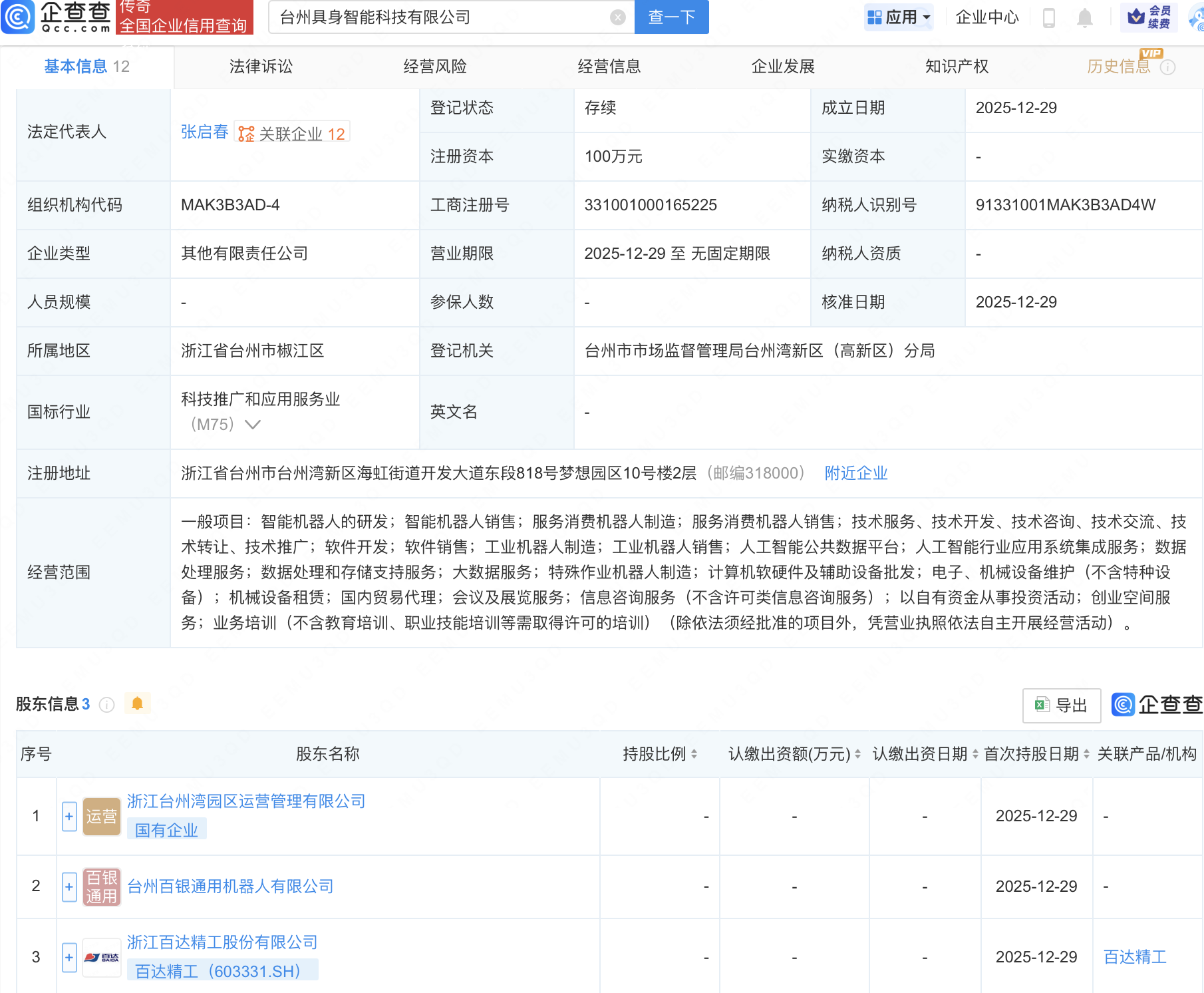 近日,台州具身智能科技有限公司成立,经营范围包含:智能机器人的研发;智能机器人销售;服务消费机器人制造;人工智能公共数据平台;人工智能行业应用系统集成服务等。企查查股权穿透显示,该公司由百达精工(603331)等共同持股。